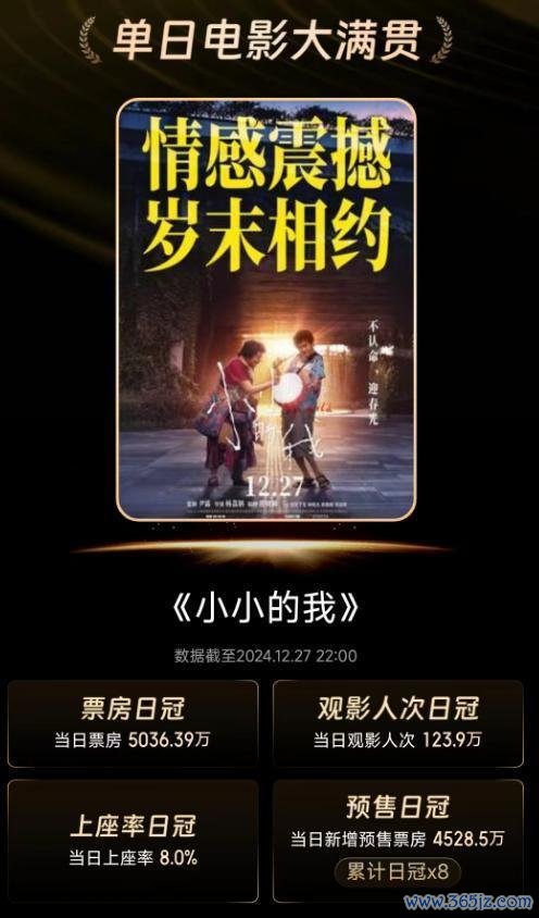 让东说念主没念念到的是,《小小的我》上映首日就拿下大满贯,一共拿到了票房日冠、不雅影东说念主次日冠、上座率日冠等8个日冠建立。