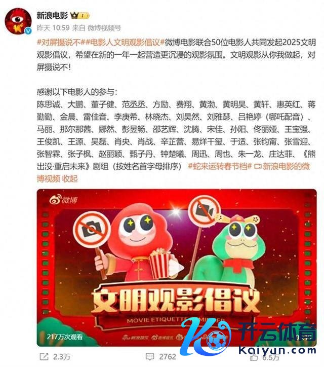 为了您更好的阅读互动体验,为了您实时看到更多内容,点个“存眷”开云(中国)kaiyun网页版登录入口开云体育,咱们每天为您更新精彩资讯! 《万众醒目春节档 明星们联袂敕令闲雅不雅影》 年年齿岁花通常,岁岁年年东谈主不同。2025年的春节莅临前夜,一派好意思瞻念良善的氛围阴私着神州地面。在这喜庆祯祥的时节,一批明星大咖们肩负起了非凡的背负——他们发出了敕令,但愿公共在赏玩春节档期内的热点大良晌,大略保握闲雅有礼的不雅影格调,鉴识各式扰民作为。 这份名单中有演员、导演、配音演员等,遍布影视圈各个鸿
