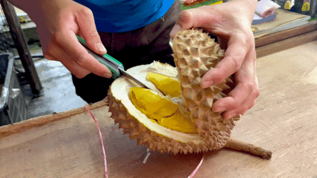 槟城的榴莲档口上,一东说念主一桌,现杀一只榴莲,一位密斯姐讲理且淡定地吃完一整只榴莲,便是最常见的情形。