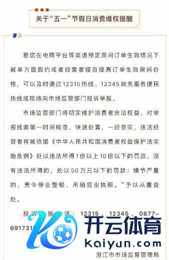 27日,澄江市商场监督经管局再次发布对于五一假期糟践教唆,称糟践者在电商平台等渠说念预订房间订单收效情况下,被片面失言概况规画者私自擢升订单收效房间价钱,不错实时通过12315热线、12345政务做事便民热线或现场向商场监管部门投诉举报。商场监管部门将切实堤防糟践者正当权利,对举报陈迹第一时分核查、快速处理,也曾查实,作歹规画者将被依据《中华东说念主民共和国糟践者权利保护法扩充条例》处以作歹所得1倍以上10倍以下的罚金,莫得作歹所得的,处以50万元以下的罚金;情节严重的,责令歇业整顿、铲除商业派司。给以从重查处。