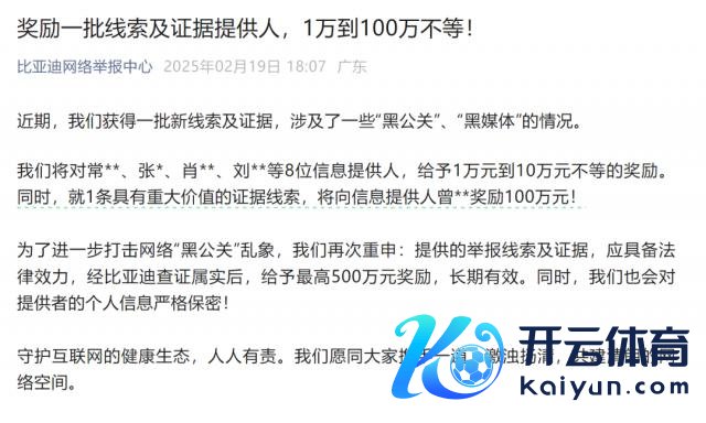 在汽车行业,零跑汽车并不是首家重金赏格搜集"黑公关"萍踪的车企。比年来,伴跟着国内新动力汽车销量的不时攀升,汽车商场竞争日益热烈,与此同期,车企被坏心漫骂、网罗谣喙以及黑公关等乱象也频繁发生,部分媒体及博主为诱骗流量、赚取收益,不吝散漫造作信息、坏心挫折漫骂、虚假虚假的中伤企业,而这些失当举止不仅骚扰了商场往往顺次,更严重的还会对车企的名誉时时会变成弘大的贬损,给车企带来千里重的赔本。在不时受到血口喷人之后,越来越多的车企开动强势反击,其中就包括通过不同金额的赏格神气面向社会寻找萍踪打击黑公关情状,包括比亚迪、蔚来法务部、鸿蒙智行发言东说念主、极氪法务部、赛力斯汽车法务部、广汽集团等均曾发布过赏格公告。其中,早在 2021 年,比亚迪就开设了萍踪举报奖励机制,以此向全网搜集"黑公关"萍踪,赏格金额从开始的 5 至 100 万元,到如今已熏陶至 5 至 500 万元,且弥远有用。