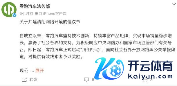 3 月 2 日,零跑汽车法务部发布《对于共建明朗网罗环境的倡议书》。零跑汽车法务部默示,即日起,零跑汽车讲求启动"明朗举止",面向社会各界绽开网罗黑公关举报渠说念,对提供有用萍踪者给以奖励,额度达 5 万元至 500 万元东说念主民币。