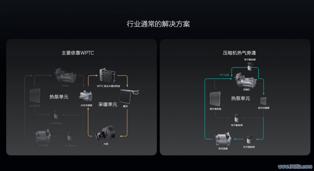当今行业内大部分电动汽车针对冬季采暖有两种老例解法,使用最世俗的是PTC(加热器,用于电板或乘员舱加热的热源产生)胜利加沸水或空气采暖,简便快速,但要作念到兼顾朔方较凉爽地区(-20°C)的采暖需求,体积、分量和能耗齐会大幅加多;此外也有车企接管热气旁通有筹办,通过电动压缩机自愿烧采暖,但这种采暖形势在运行段的制热速率慢且压缩机转速高、杂音大。