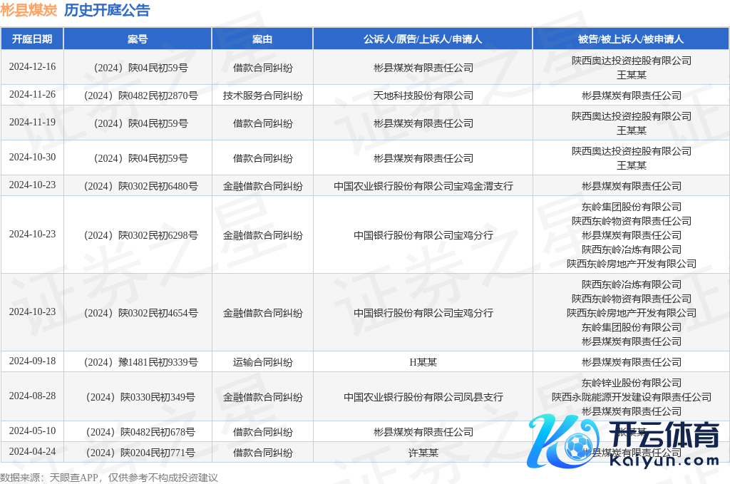 本站音信,字据天眼查APP露出开yun体育网,近日公布了一则彬县煤炭有限包袱公司行动被告/被上诉东说念主的开庭公告,详备执行如下: