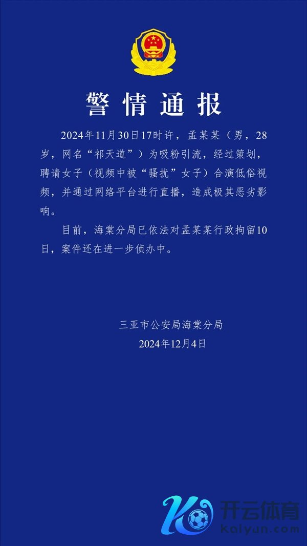 4日半夜,三亚市公安局海棠分局发布通报:2024年11月30日17时许,孟某某(男,28岁,网名“祁天说念”)为吸粉引流,流程筹备,聘用女子(视频中被繁杂女子)合演低俗视频,并通过汇注平台进行直播,酿成极其恶劣影响。