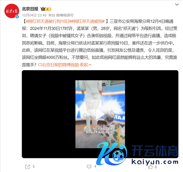 快科技12月5日音书开yun体育网,日前,快手网红祁天说念在直播时为了博眼球和逢迎粉丝,对一女子作念出屡次不当活动,活动行径极为媲好意思,相干视频在汇注引起热议。 4日半夜,三亚市公安局海棠分局发布通报:2024年11月30日17时许,孟某某(男,28岁,网名“祁天说念”)为吸粉引流,流程筹备,聘用女子(视频中被繁杂女子)合演低俗视频,并通过汇注平台进行直播,酿成极其恶劣影响。 现在,海棠分局已照章对孟某某行政拘留10日,案件还在进一步侦办中。 据网友先容,在直播中,祁天说念手拿竹签捅戳该女子