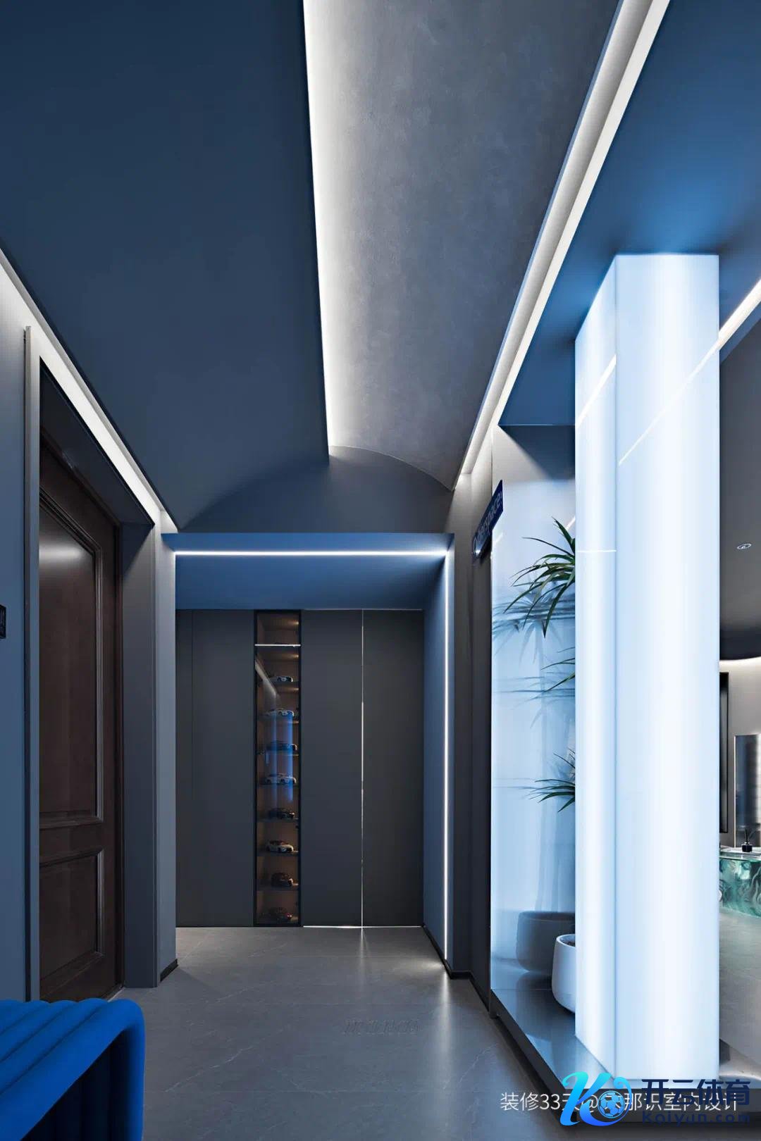 这张图来自末那识室内筹谋,统共案例贯穿请点击《126平超酷深色赛博氛围三室》。蓝色氛围灯用上之后,统共氛围就真挺赛博的。