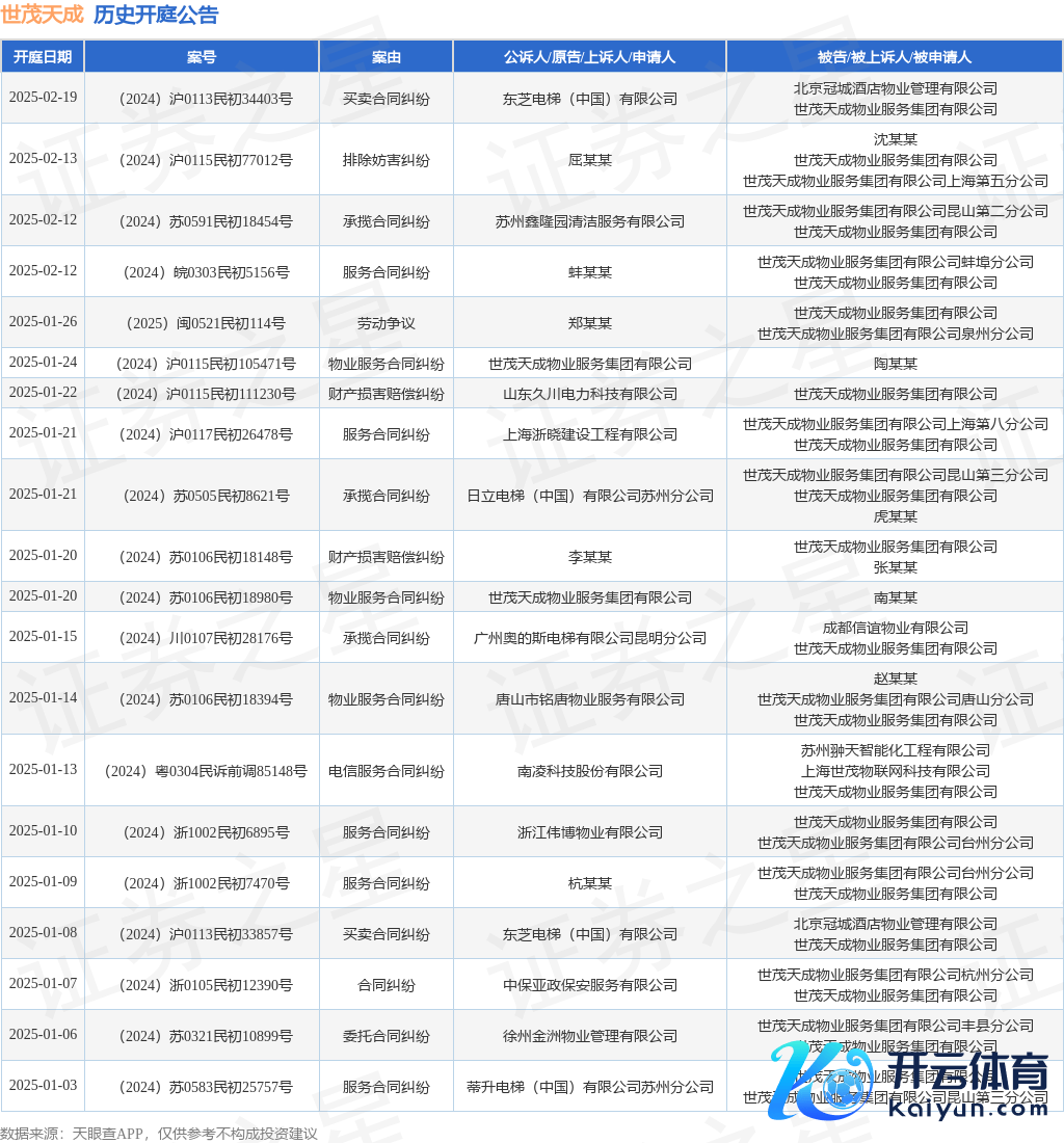 案号:(2024)浙0105民初12390号审理法院:杭州市拱墅区东说念主民法院案由:契约纠纷当事东说念主信息: 原告/上诉东说念主:中保亚政保安处事有限公司 被告/被上诉东说念主:世茂天成物业处事集团有限公司杭州分公司、世茂天成物业处事集团有限公司开庭日历:2025年1月7日凭证统计,近一年内以世茂天成物业处事集团有限公司为当事东说念主的历史开庭公告有282则,其中案由为“物业处事契约纠纷”的公告以103则居首,其次为“处事契约纠纷”有43则,“诞生工程分包契约纠纷”有19则。历史开庭公告(前20条)如下: