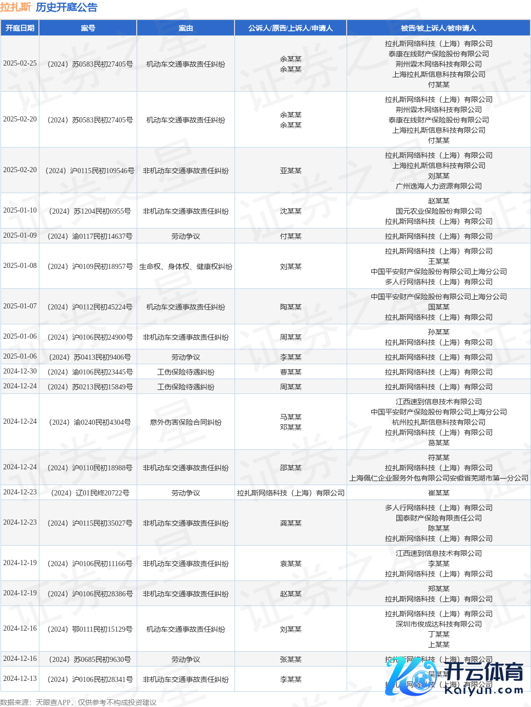 案号:(2024)沪0112民初45224号审理法院:上海市闵行区东谈主民法院案由:灵活车交通事故连累纠纷当事东谈主信息: 原告/上诉东谈主:陶某某 被告/被上诉东谈主:中国吉祥财产保障股份有限公司上海分公司、国某某、拉扎斯收罗科技(上海)有限公司开庭日历:2025年1月7日笔据统计,近一年内以拉扎斯收罗科技(上海)有限公司为当事东谈主的历史开庭公告有174则,其中案由为“非灵活车交通事故连累纠纷”的公告以72则居首,其次为“管事争议”有31则,“工伤保障待遇纠纷”有28则。历史开庭公告(前20条)如下: