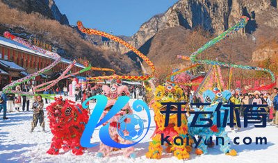 河南云台山景区,雪地上的舞狮饰演诱导搭客不雅看。