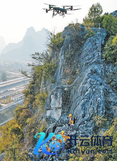 黔桂铁路一处沿线山体上,国铁南宁局柳州工务段桥隧工用无东说念主机运载的材料整治危石。