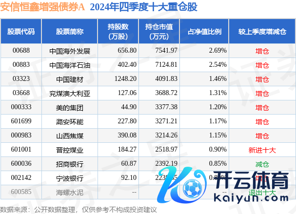 安信恒鑫增强债券A为债券型-搀和二级基金,把柄最新一期基金季报线路,该基金钞票建树:股票占净值比18.68%,债券占净值比84.82%,现款占净值比5.14%。基金十大重仓股如下: