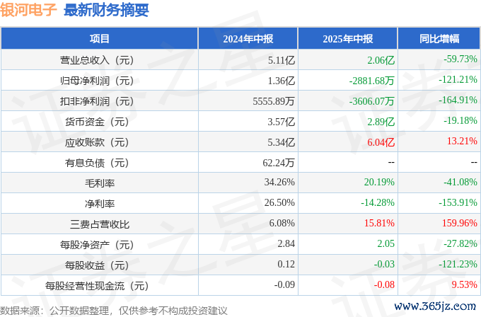 据本站公开数据整理,近期星河电子(002519)发布2025年中报。截止本敷陈期末,公司营业总收入2.06亿元,同比下落59.73%,归母净利润-2881.68万元,同比下落121.21%。按单季度数据看,第二季度营业总收入1.18亿元,同比下落47.96%,第二季度归母净利润-1253.13万元,同比下落129.92%。本敷陈期星河电子三费占比高潮彰着,财务用度、销售用度和责罚用度总数占总营收同比增幅达134.51%。 本次财报公布的各项数据办法发达不尽如东谈主意。其中,毛利率20.19%,