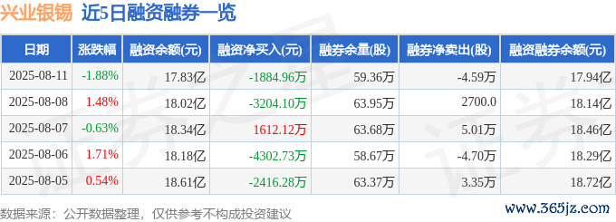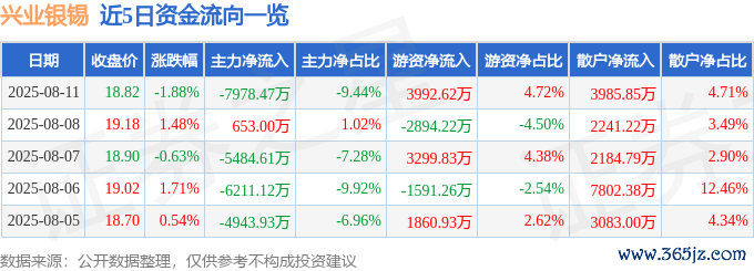 本站音书开yun体育网,为止2025年8月11日收盘,兴业银锡(000426)报收于18.82元,着落1.88%,换手率2.53%,成交量44.92万手,成交额8.46亿元。