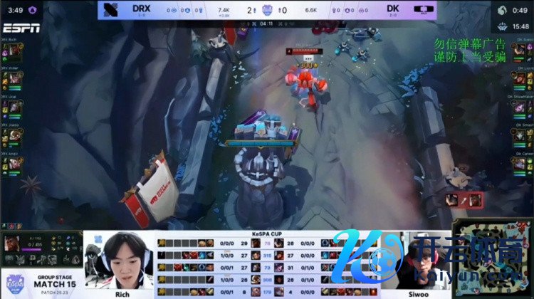 [15:51]前卫团,Career波比锤飞Vincenzo赵信,许哥辛德拉推到Rich奎桑提,Lucid山公拿到Rich东说念主头,Smash烬双杀扫尾,DK打出1换4,中路放出前卫撞掉DRX二塔。