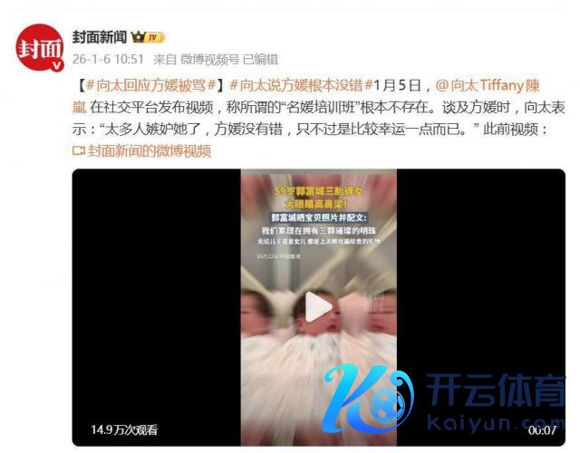 一句"方媛莫得错"欧洲杯体育,让向太陈岚冲上热搜。据 1 月 6 日报谈,向太在外交平台发布视频,火力全开,为郭富城的配头方媛强势辩说,锋芒直指那些给她贴上"捞女"标签和炒作"名媛培训班"传说的网罗恶评,中枢论断就一句:太多东谈主忌妒她了。