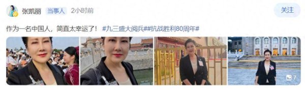 9月3日是抗战得胜80周年的好日子,一早,天安门广场就齐集了稠密不雅看检阅庆典的名东谈主,除了体育天团以外,文娱圈不少艺东谈主也来到了现场,一皆见证故国的闹热广阔。 一级演员张凯丽晒出不雅礼现场图,她说四肢别称中国东谈主,险些太庆幸了。 张凯丽直言我方看到和平鸽在天上飞的本领,是确凿忍不住,我以为中国东谈主都会和我不异感奋高慢,在说这些的本领,张凯丽抹了下眼泪,好多不雅看直播的网友也暗示,和平鸽放飞的那一刻,太悠扬了,让东谈主泣弗成声。 歌手雷佳晒出现场图,这是她时隔6年后,再次来到现场不雅看