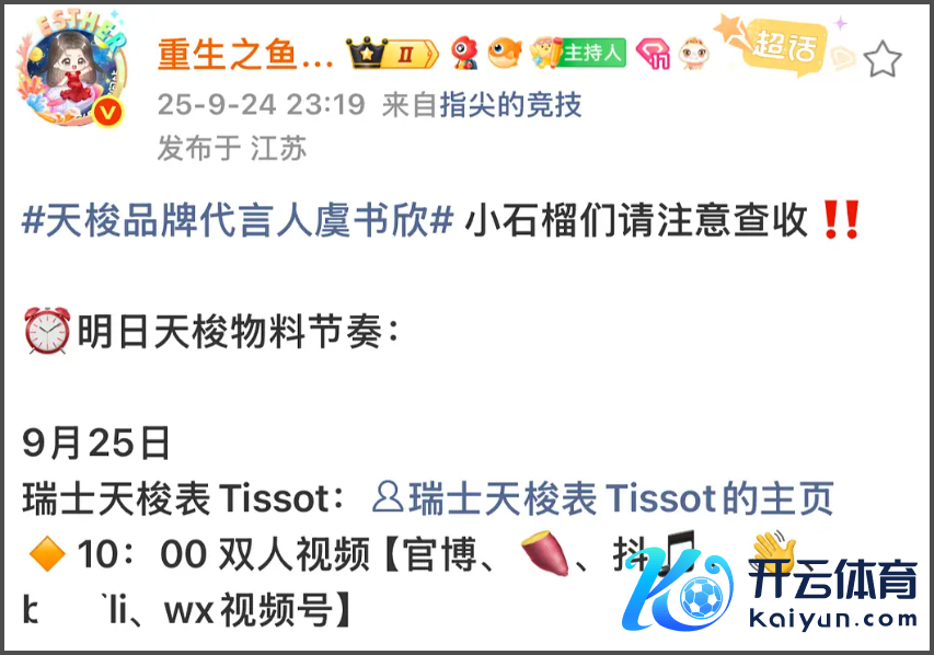 据悉,原定虞书欣会在9月25日官宣新的代言物料,对接前一天深夜就发文求教粉丝作念好控评准备,说品牌会全平台宣发虞书欣和龚俊的双东说念主物料。